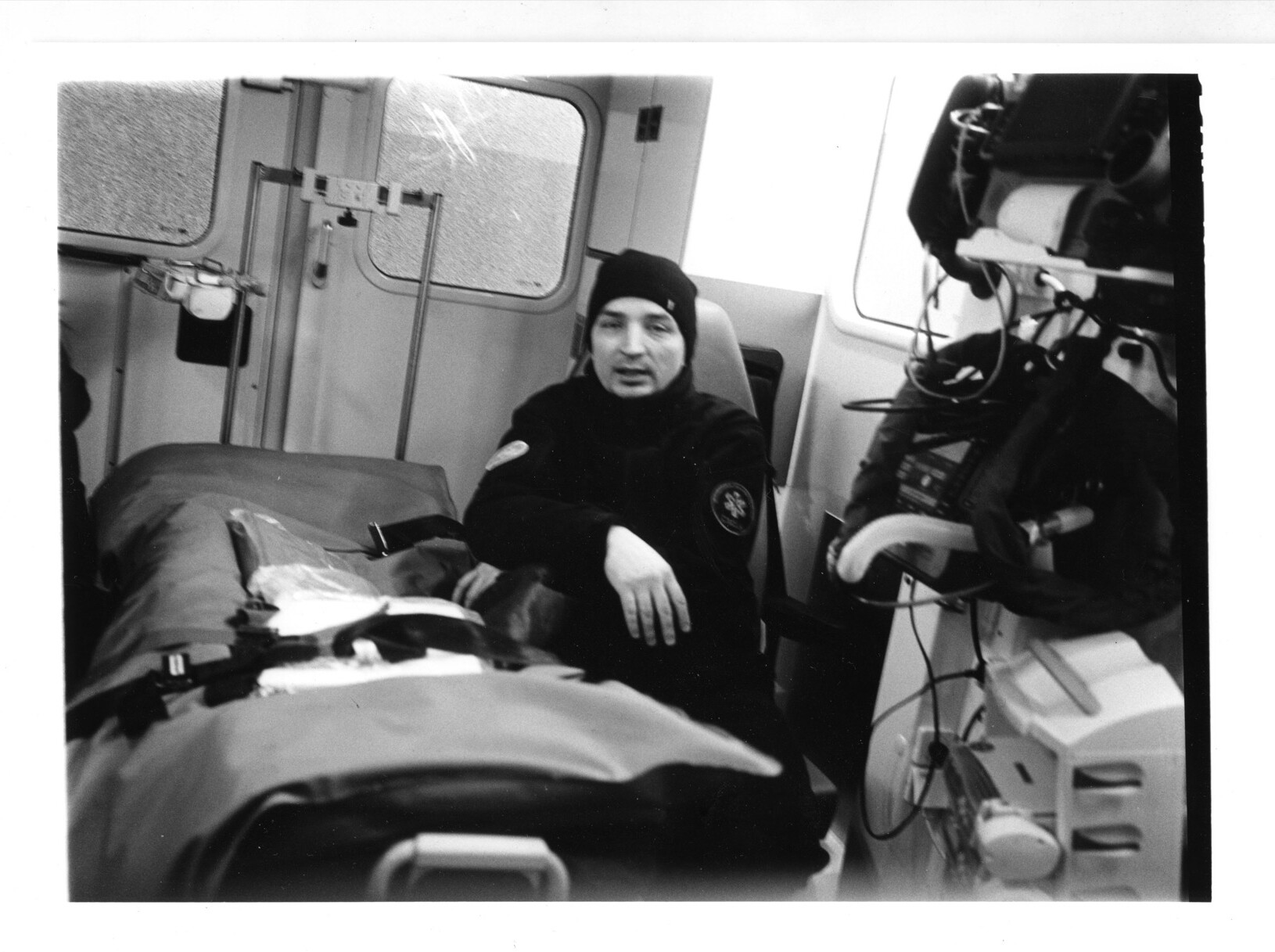 arrive and gather in the kitchen to fuel up for the day. CADUS evacuates critical patients from one location to another. A call can come in at any moment and the days are rarely planned. A call comes in. We’re scheduled to leave at 10:30, transporting a patient from a hospital in Dnipro to the military evacuation train, a fully functioning hospital on rails. I’m introduced to the team and it’s explained why they’re bringing a photographer along. The staff is mostly Ukrainian, with two volunteers from abroad. It’s time to head out. I’m not sure what to expect from this deployment. I agreed to come to see, to prepare for what lies ahead. The team consists of three people, plus me: a driver, a doctor, and an assistant. The ambulance is a tight space; I get a brief introduction on where to stand and how not to get in the way.