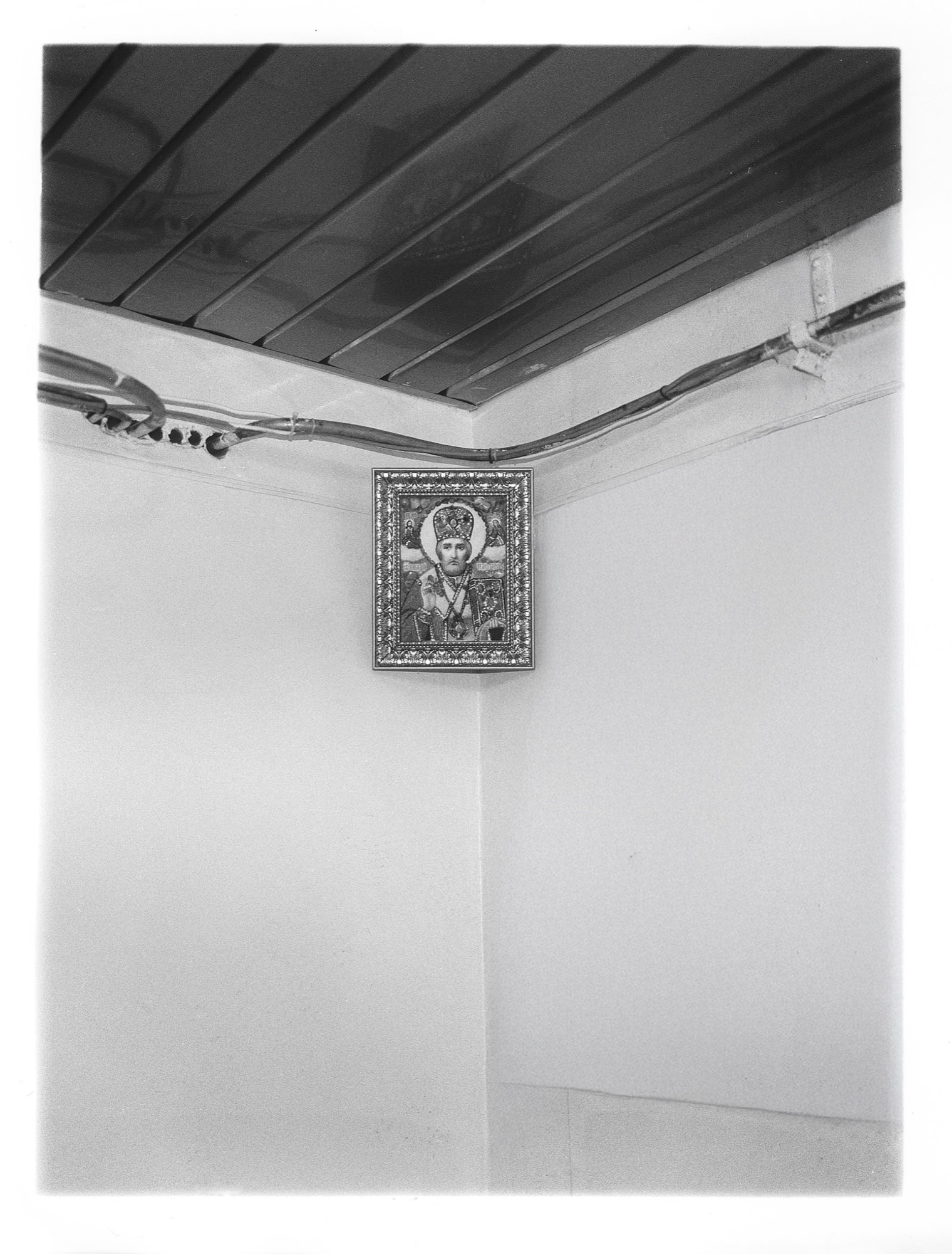 hospital. A nurse guides us into a section designated for the military. We pass relatives waiting on wooden benches outside. The tension is palpable—you could hear a needle drop. People stare into emptiness; their thoughts elsewhere. Everything is bathed in blue light, sterile and clean, as if people only pass through and leave no trace. A thought I’ve had since childhood resurfaces: no human being should be here. It feels alien, lifeless. The paradox is that lives are saved here. It always leaves me restless. I wait in the corridor as the others enter the room. On one side hangs a picture of an Orthodox saint; opposite it, a Ukrainian flag covered in signatures.